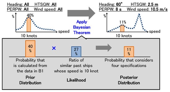 In this study, the estimation target is the voyage speed; the prior distribution is the probability distribution of the voyage speed generated from the data in B1; the likelihood function is the probability distribution of past data with similar bow directions, wave heights, wave periods, and wind speeds as the considered vessel; and the posterior distribution is the probability distribution of the voyage speed reflecting the likelihood function in the prior distribution. Note that both the prior distribution and likelihood function are histograms created using real data. Figure 8 illustrates how Bayesian learning is used to calculate the voyage speed. Bayes’ theorem is applied to each class of the histogram for the voyage speed. In Figure 8, the probability of distribution in the 10 knots class is 40%, which is calculated from the data in B1. Likelihood is calculated from the data of the ship whose heading is 60 degrees, HTSGW is 2.5 m, PERPW is 8 s, and wind speed is 10.5 m per second. Finally, the probability of posterior distribution is calculated by multiplying the prior distribution and likelihood, as shown in Equation (2), which is 11%. The same procedure is used for the other voyage speed classes, and the prior and posterior distributions are obtained by normalizing the calculated histogram to 1.