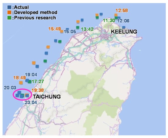 Figure 9 shows the actual route taken by TS OSAKA, which departed from KEELUNG on 29 April 2020 at 11:30 a.m. and compares the arrival times and routes predicted using the method of Alessandrini et al. and the proposed method. The route obtained using the predicted method is closer to the actual route than the one obtained by Alessandrini et al. However, the arrival time predicted by the proposed method is three hours earlier than the actual arrival time, which may result from a detour the vessel took before entering Taichung port (see the pink circle in Figure 9). As the voyage speed during the detour was 5 knots or lower, Taichung port may have been crowded, delaying vessel entry into the port.