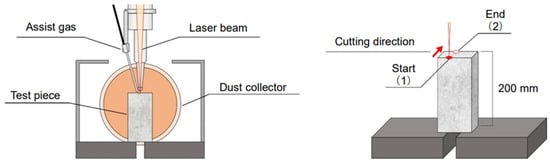 Table 2 lists the laser irradiation conditions. The irradiation conditions represented a combination of two levels of laser power and five levels of cutting speed. Laser irradiation was performed twice under each condition.