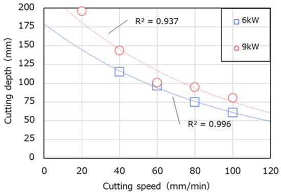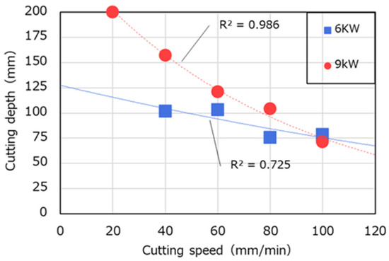 The laser was able to cut to a depth of 116 mm when the power and cutting speed were 6 kW and 40 mm/min, respectively. In addition, when the power and cutting speed were 9 kW and 40 mm/min, respectively, the laser was able to cut to a depth of approximately 150 mm. Therefore, the average cutting depth for the 9 kW laser power was 1.28 times that of the 6 kW laser power. The correlation coefficient between the cutting speed and cutting depth at a concrete strength of 20 N was greater than 0.9.