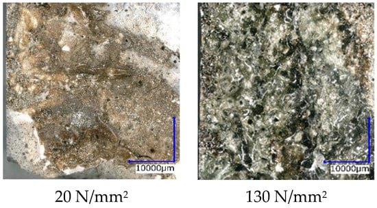 While observing the cross-sections, the specimen with a strength of 20 N/mm2 showed dull vitrification. Contrastingly, the specimen with a strength of 130 N/mm2 showed glossy vitrification. This is because when the concrete strength is low, the impact of the laser is channelled in the depth direction, whereas when the concrete strength is high, heat tends to accumulate locally, owing to the higher thermal conductivity and density [19,20].
