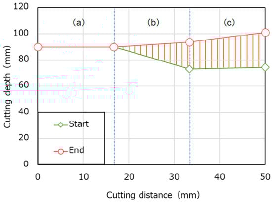 Figure 8 shows the cutting depth at the start and end points of the cutting distance. This graph indicates that the cutting depth at the cutting start and end points was the same until a cutting distance of approximately 20 mm was reached. At a cutting distance of 20–35 mm, the cutting difference increased. When the cutting distance was in the range of 35–50 mm, the cutting difference was almost the same. This phenomenon indicates that the effect of the concrete material on the concrete cutting differs depending on the cutting distance. This point has not been discussed before. It is important to understand this phenomenon in the case of cutting concrete over 80 mm using a high-power laser.