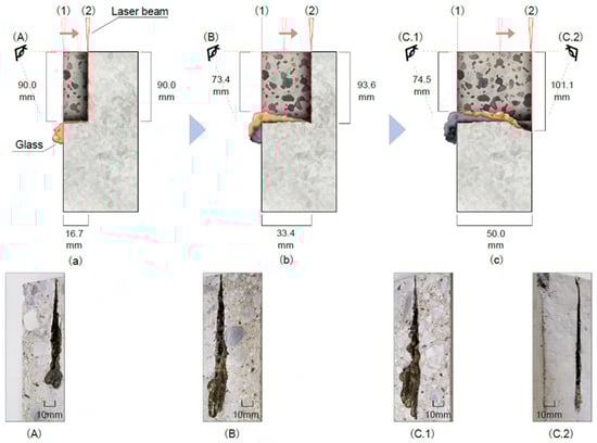 Figure 9 shows a schematic diagram of the cutting difference regarding the heat influence by laser cutting distance. This figure shows the surface condition of the cutting start point because of the difference in cutting distance. The upper part shows the concrete inside the model according to each cutting distance. The lower row shows the photograph of the cutting start point for each cutting distance. The 50 mm point shows the cutting start point (c.1) and cutting end point (c.2) only. This model describes the situation in Figure 8.