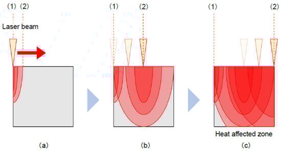 Figure 2 shows a schematic of the difference in cutting depth. As shown in Figure 1, cutting with a laser requires a straight line to move the laser beam. When moving the beam, the speed, power, and gas pressure of the assist gas are maintained at a set level. However, the measured cutting depths differed at the start (1) and end (2) of the laser cut area, with a smaller cutting depth at the start (we refer to this difference as the cutting difference), as shown in Figure 2. The cutting difference can be calculated as follows: