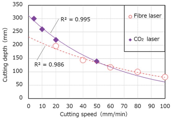 Figure 11 shows the cutting depths of the CO2 and fibre lasers when the laser power was 9 kW. The cutting depth of the CO2 laser was approximately 20 mm greater than that of the fibre laser at the cutting speed of 20 mm/min. This is due to differences in focal length, power density, assist gas flow rate, and similar parameters caused by differences in the laser oscillator and irradiation conditions. However, at the cutting speed of 50 mm/min, an identical cutting depth was obtained. Although CO2 laser data were not available, the results in the graph show that the cutting depths of the CO2 and fibre lasers were reversed or approximately the same at cutting speeds greater than 50 mm/min. Thus, both the CO2 and fibre lasers were roughly equivalent in terms of their cutting effectiveness in concretes at high speeds. However, the CO2 laser resulted in deeper cutting depths at slower speeds.