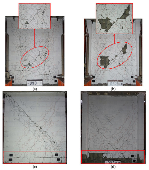 - All the walls presented diagonal shear failure. The stepped cracks along the bed joints and vertical joints and diagonal crack crossing the units and mortars were observed. The first sets of visible diagonal cracks in the prefabricated walls were located at both segments at the wall ends. Furthermore, the cracks in the cast-in-place specimens were mainly distributed in the lower half of the walls. The grout in the first course of the wall peeled off because of the lack of protection from unit face shells where the vertical rebar overlapped. This illustrated that the use of cleaning-hole units and overlapped reinforcement changed the crack distribution.