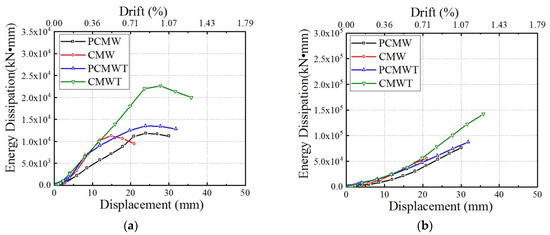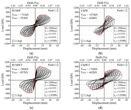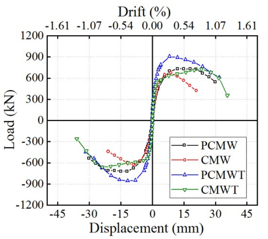 - All the test specimens displayed symmetric behavior until the peak load. The lateral capacity of PCMWT and CMWT with a T-shaped section was 21% and 7% higher than that of the corresponding rectangular sections of PCMW and CMW, respectively. Regarding the construction method, the lateral capacity of PCMW and PCMWT was 12% and 27% higher than that of the corresponding cast-in-place walls, CMW and CMWT, respectively.