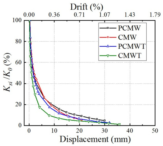 - The initial stiffness of the test walls in this study was predominantly influenced by the cross section. The T-shaped cross section increased the initial stiffness of the specimens by 62% compared to that of rectangular walls. The secant stiffness decreased sharply at low values of drift and then dropped slowly at high values of drift. Additionally, the stiffness of specimens with flanges decreased more rapidly than did that of cast-in-place walls until the first major diagonal crack occurred.