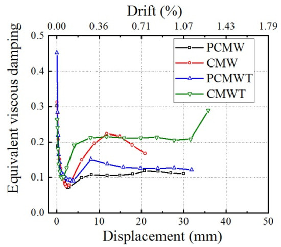 - The slope had an obvious increase when the first major diagonal crack occurred. The cast-in-place walls had higher energy dissipation capacity than did the prefabricated ones at the same lateral drift. The T-shaped cross section improved the energy dissipation capacity compared to that of the rectangular section. Then, the equivalent damping ratio dropped rapidly to approximately 0.10 and finally remained stable at a value of 0.13 and 0.26 for prefabricated and cast-in-place walls, respectively.