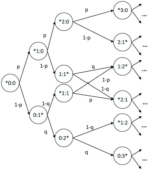 An illustration of the iid-based model is shown in Figure 1 (throughout the paper, serve winning probabilities for home and away teams will be denoted as p and q, respectively, which is consistent with the notation already used in [19]). If the data do not allow to discern which team was the “home” team (or the usual definition of “home” team is not applicable to the sport or match in question), the team whose historical statistics showcase advantage over the other team will be proclaimed as the “home” team. In cases of evenly matched teams, the “home” team notion will be applied arbitrarily. This, while not being ideal, is important because it allows keeping the notation consistent throughout all the matches (in all available data), which depicts a Markov model for the first three points of a volleyball match (the way of modeling subsequent points can be easily extrapolated). Each state depicts a score and the star denotes which team was on serve.