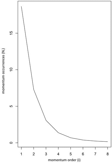 Figure 3 shows the number of momentum occurrences () in an average match for an average team depending on the momentum order (i). For example, the value represents the number that tells how many times the team has won three points in a row. By analyzing Figure 3, it is evident that momentums of the fourth order and beyond appear extremely rarely during the matches in the dataset used in this research. This means that the low number of observations pertaining to these momentums does not provide statistically relevant results. For this reason, the evolving probability method proposed in this paper implements the short-term momentum only up to the third order, even though the method can be very easily extrapolated to work with momentums of higher orders if desired.
