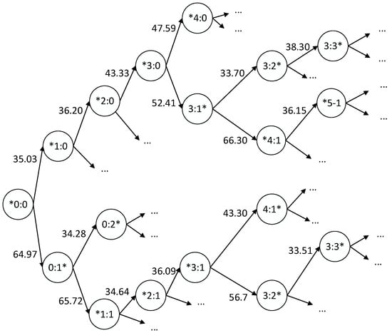 Figure 4 shows a match tree that incorporates the proposed combined Formulas (7) and (8). The figure shows the changes of serve probabilities throughout the match for both teams. In order to demonstrate the example, a match with the following characteristics is selected: , , , , , , , and . Values and are selected as the parameters of the linear function. In the approach proposed in this paper, after each rally, the non-constant input parameters of the proposed functions (7) and (8) are updated. Those parameters are the following: , and . After updating the values, Equations (7) and (8) are used to calculate the probabilities of winning a point on a team’s own serve. Each state has exactly two exclusionary transition probabilities, so it is possible to describe a volleyball match as a binary tree where each leaf represents a non-unique match result and all nodes with the same number of total points are at the same tree depth.