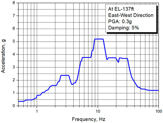 All input motions corresponding to each PGA level were obtained by linearly scaling for the input motion of PGA = 0.3 g presented in Figure 3. When considering an actual earthquake event, the PGA levels above 0.3 g of SSE in the test matrix will be greater than linearly scaled levels because the design floor response spectrum used for the shaking table tests will be practically reduced due to the plastic behavior of the building structures, which can be represented by the inelastic energy absorption factor (IEAF). When taking the IEAF to be 1.25 as recommended in EPRI/NP-6041-SL [24], the PGA levels for 0.5 g and 0.6 g can be treated as 0.625 g and 0.75 g levels, respectively.