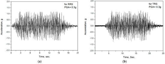 Acceleration time histories for shaking table input motion (PGA = 0.3 g): (a) Corresponding to RRS; (b) Corresponding to TRS.
