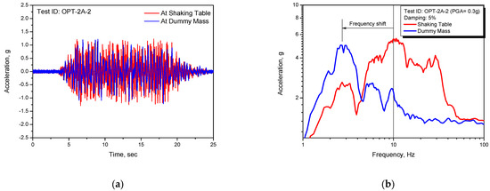 As clearly shown in the above test results of the acceleration time history responses, the seismically-isolated structures reveal the seismic isolation performance as expected from the frequency shift effect presented in Figure 5b of results of the response spectrum, which are for the shaking table and the dummy mass.
