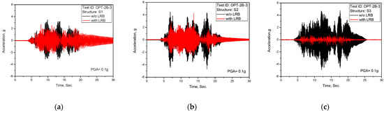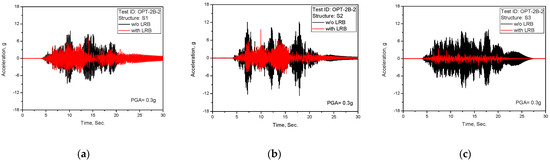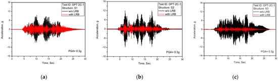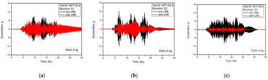 Test results of acceleration time history response (TEST ID: OPT-2B-2, PGA = 0.3 g): (a) S1; (b) S2; (c) S3.