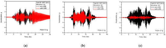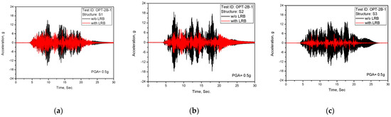 Test results of acceleration time history response (TEST ID: OPT-2A-1, PGA = 0.5 g): (a) S1; (b) S2; (c) S3.