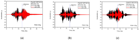 - In the test results of the PGA = 0.6 g in Figure 13, LRB failure occurred after 13 s due to exceeding the LRB shear strain limits of 600% (120 mm), which has been confirmed in previous quasi-static tests [21].