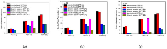 Test results of acceleration time history response (TEST ID: OPT-2A-2, PGA = 0.3 g): (a) S1; (b) S2; (c) S3.