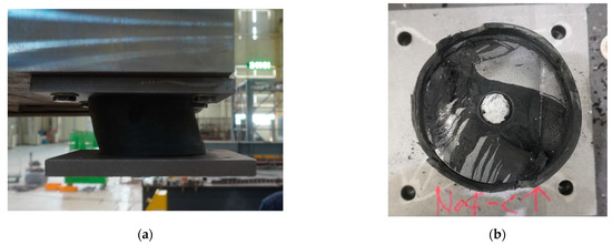 In the case of the ultimate test with PGA = 0.6 g (Test ID: OPT-2C-2), the failure of LRB occurred after 13 s during the test. At this time, the maximum shear displacement was measured to be 137 mm (685%), significantly exceeding the beyond design shear displacement of 80 mm. Figure 17 presents the photos showing the failed LRB after tests.