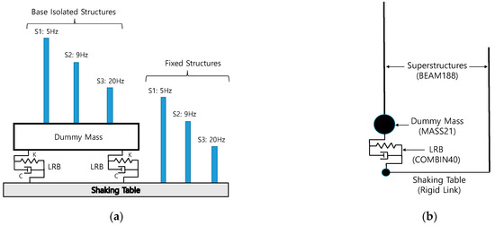 Figure 18 presents the schematic concept of the seismically isolated test mockup performed in this study and the corresponding finite element model used for the seismic analysis. As shown in Figure 18a, there are three different beam structures both on the shaking table and on the dummy mass, which is intended to express a seismically isolated structure and the non-isolated structure. Figure 18b is the corresponding seismic analysis model used in this study.