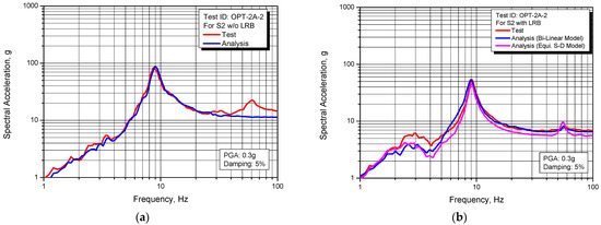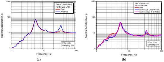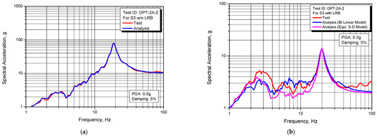 Comparison of response spectrum between test and analysis for S2 structure: (a) Non-isolated; (b) Seismically isolated.