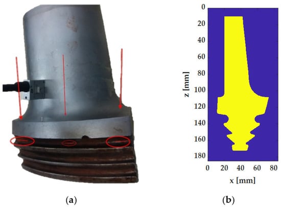 To verify the feasibility and performance of the proposed ice-coupled ultrasonic FWI tomography to evaluate the defects in complex-shaped parts, a series of numerical experiments were conducted. The turbine blade is a typical safety-critical component in the aerospace industry with a complex geometry, as shown in Figure 2a. In conventional ultrasonic testing, phased array ultrasonic transducers can only be placed to directly contact smooth surfaces at the upper part. It makes the defects at the lower part difficult to inspect, such as the red circles in Figure 2a. To inspect the defects at different positions, the transducer should be moved to different positions, shown as the red line. This complex object was applied in this study. To save computational costs and storage space, only 2D tomography was carried out for a typical cross section of the turbine blade in this study, as shown in Figure 2b. To facilitate the fast acquisition of a full ultrasonic wavefield for FWI tomography, an acoustic model rather than an elastic model was adopted here to simulate the process of ice-coupled ultrasonic testing because the acoustic model is commonly employed in ultrasonic NDT research [,]. All of the wave phenomena including multiple reflections from the ice-steel interface and the wave-defect interaction can be revealed in such a model. It is necessary to note that in a real case shear waves could exist in a solid due to mode conversion at the interface and defects. Numerical experiments were carried out to optimize the key parameters such as the frequency selection and iteration number to quantitatively detect different types and numbers of defects in a turbine blade.