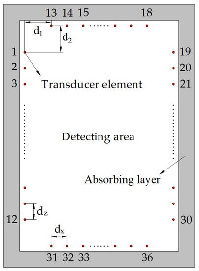 The turbine blade was encased by ice as shown in Figure 2b. The material properties of the turbine blade and ice are shown in Table 1 []. The size of the whole model was 185 mm × 85 mm. A series of ultrasonic transducers were deployed evenly around the turbine blade. Considering that the length of the specimen in the horizontal direction was approximately half that of the vertical direction, 6 transducers were arranged at the top and bottom sides and 12 transducers at the left and right sides, shown in Figure 3. Such an arrangement of transducers can reduce the transducer number and assure the imaging quality. At four corners, the spacing of two adjacent transducers was set as . The PML boundary was set around the calculation domain to absorb outgoing waves and avoid reflection. To avoid uncertain factors further from the absorbing layer, all transducers were shifted inward from all sides by 1 mm. It was an effective simplification to simulate the wave propagation in a large domain because the reflections from the boundaries beyond the area of interest could be excluded by applying appropriate time gates to the recorded signals. The spacing of the transducers was in a horizontal direction and in a vertical direction.