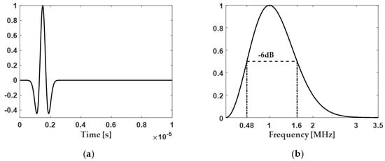 where was the center frequency and referred to the time delay. As the theoretical resolution of the FWI is a half wavelength [,], an ultrasonic wave with a center frequency of 1 MHz was applied to inspect a defect as small as 3 mm in the turbine blade. When and , this excitation waveform and the corresponding amplitude spectrum are depicted in Figure 4. It could be seen that the dominant energy (above the value of a −6 dB drop from the maximum amplitude) was within the effective frequency band of 0.48 MHz–1.6 MHz. A quadrilateral mesh was applied to discretize the spatial domain and the mesh size was carefully chosen to satisfy the Courant–Friedrichs–Lewy (CFL) condition. The mesh size was chosen as in both directions for an accurate acoustic wave calculation up to a frequency of 2 MHz (about 10 elements per minimum wavelength) []. To ensure numerical stability, the time step should be chosen carefully according to the smallest element and the wave speed. Here, time step was set as , where was the wave speed in the steel.