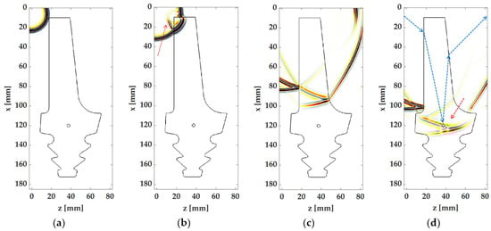 Ultrasonic wave propagation excited with the transducer at different time slots: (a) t = ; (b) = ; (c) = ; (d) = .