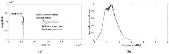 At first, a single internal defect was embedded in a turbine blade to perform data processing and a parametric study of ultrasonic FWI tomography. For simplicity, a circular hole with a diameter of 3 mm was located at (40,120). In the first simulation, an ultrasonic wave was excited with the first transducer located at (1,6). The corresponding wave propagations at different time slots are shown in Figure 5. From the simulated wavefield, the ultrasonic wave reflected at the ice-steel interface and diffracted with the defect. At , the incident wave began to reach the edge of the blade. The reflection from the ice-steel interface can be seen in Figure 5b, indicated by a red arrow. The transmitted wave and several interface waves propagated inside the blade. When , the direct wave arrived at the receiving transducers as shown in Figure 5c. At , the propagating waves interacted with the defect, generating diffracted waves, which can be seen in Figure 5d. Finally, the ultrasonic wavefield was recorded by all of the 36 transducers. Without a loss of generality, the waveform recorded by the receiver placed at (84,6) and its normalized amplitude spectrum are shown in Figure 6. The first wave package was the direct wave from the transducer to the transducer. In addition, there were two more waves due to the reflection at the boundary and the diffraction from the internal defects. The path of the diffraction wave from the defect is depicted in Figure 5d with blue dashed lines. The corresponding time-of-flight was about . Thus, the second wave package was the diffracted wave from the defect, followed by multiple waves reflected from the lower boundary of the blade. All of the reflections from the ice-steel interface and the diffraction signal from the defect can be seen in the A-scan signal in Figure 6a. Due to the complex geometry of the turbine blade, reflection signals from the boundaries were complicated and the energy was very high, making the diffracted wave from the internal defect difficult to identify. Moreover, compared with the excitation, the amplitude spectrum was distorted to a certain degree due to the existence of wave scattering phenomena, as shown in Figure 6b. Nevertheless, the recorded signal still contained information at frequencies around 1 MHz with a large bandwidth.