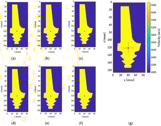 Tomographs of the 3 mm circular hole based on successive-frequency inversions at: (a) 0.4 MHz; (b) 0.6 MHz; (c) 0.8 MHz; (d) 1 MHz; (e) 1.2 MHz; (f) 1.4 MHz; (g) 1.6 MHz.