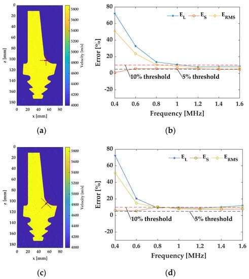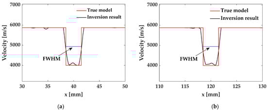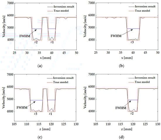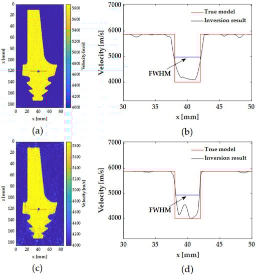 The tomograph results are shown in Figure 16a,c. In both cases, this defect could be accurately reconstructed. Compared with Figure 9 in Section 4.1, the reconstruction results showed more background noise. From the comparison of the vertical and horizontal profiles, as shown in Figure 16b,d, the RMS error of the FWHM was 5.42% for the −2% error in the initial model and 8.23% for the +2% error in the initial model. Compared with the relative error, which was smaller than 2% in Section 4.1, the inaccuracy of the initial model increased the relative error for the inversion. Vice versa, accurate parameters for the initial model could improve the final result. Nevertheless, the overall error was smaller than 10% and it was acceptable for the practical application in NDT even with a slight variation in the initial model.