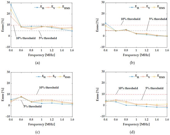 The variation of relative errors of the FWHM as a function of successive-frequency inversions for circular holes: (a) 3 mm; (b) 4 mm; (c) 5 mm; (d) 6 mm.