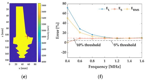 To improve the overall accuracy of the inversion, information of different frequencies should be taken into consideration. A lower frequency has a better tolerance for a relatively large-scale structure while a higher frequency should be considered for a small substructure []. Therefore, successive inversions with a moving frequency from low to high were applied to mitigate the nonlinearity of the inversion problem, resulting in a more robust result than a monochromatic inversion. In this study, a frequency group of seven discrete frequencies from 400 kHz to 1600 kHz were adopted because the excited and received signals showed an effective bandwidth of 480 kHz−1600 kHz, as shown in Figure 6b. Figure 9 shows the reconstructed tomographs when the inversion finished at frequencies of 0.4 MHz, 0.6 MHz, 0.8 MHz, 1 MHz, 1.2 MHz, 1.4 MHz and 1.6 MHz, respectively. Compared with the monochromatic inversion of 1 MHz, the overall noise was reduced based on the successive inversion of low frequencies. It could be seen that with the increase of the frequency of successive inversions, the accuracy of the 3 mm diameter circular hole was improved. The cross sections through the defect along the horizontal and vertical direction are presented in Figure 10. The FWI results showed a good agreement with the profile of the true defect in both directions. To quantitatively evaluate the reconstruction accuracy, the relative error of the full width at half maximum (FWHM) along the two directions along with their root mean square (RMS) error were considered. Therefore, the three indicators were defined as , and , where denoted the diameter of the circular defect. Figure 11 shows the variations of the relative errors of the FWHM and their RMS error as a function of the successive-frequency inversions for circular holes with different diameters. Generally, the errors decreased as the successive-frequency increased and almost converged after the frequency of 1 MHz. It meant that successive-frequency inversion could indeed improve the accuracy of FWI tomography. Especially for the 3 mm diameter defect, the relative errors sharply decreased from 28.3% to 8.5%. When the defects were larger than 3 mm, the relative errors decreased to smaller than 2%. The relatively large error for the 3 mm diameter defect was due to the fact that 3 mm is close to half of the interrogating wavelength at 1 MHz, which is the theoretical resolution of the FWI []. However, the final error was smaller than 8%, indicating that a successive-frequency FWI could obtain an accurate tomograph for internal defects and the resolution approached a half wavelength.