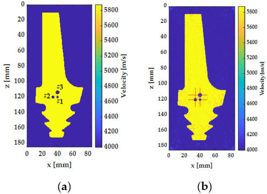 In practical engineering applications, a component probably contains multiple defects simultaneously. It should be pointed out that it is a difficult problem for an accurate inspection because multiple scattering will occur if the distance of the two defects is closed. Hence, three circular defects with different sizes were considered, as shown in Figure 13a. A central defect (marked as #1 defect) was located at (40,120) with a diameter of 3 mm. The second one with a diameter of 4 mm (marked as #2 defect) was horizontally shifted by 6 mm from #1 defect and the third one with a diameter of 5 mm (marked as #3 defect) was vertically shifted by 6 mm from #1 defect.