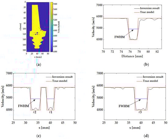 Similarly, a successive-frequency FWI was applied and the reconstructed defects are shown as Figure 13b. From the tomograph, these three circular defects were clearly discernable despite complex wave scattering due to the presence of the three adjacent defects. Furthermore, both vertical and horizontal profiles were compared with the true model as shown in Figure 14. The good agreement proved that the proposed method was capable of accurately detecting multiple defects in complex parts.
