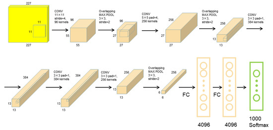 AlexNet carries forward the idea of LeNet and applies the basic principles of CNN to a very deep and wide network [39], as shown in Figure 4. The advantages of AlexNet can be described as five aspects. (1) ReLU is successfully used as the activation function of CNN, and its effect is proven to be better than that of sigmoid in the deeper network; therefore, the gradient dispersion problem of sigmoid in the deeper network is solved successfully. (2) During training, Dropout is used to randomly ignore some neurons to avoid over-fitting of the model. (3) The overlapping maximum pooling is considered in CNN to avoid the blurring effect of average pooling. (4) The Local Response Normalization (LRN) layer is proposed to enhance the generalization ability of the model. (5) CUDA is used to accelerate the training of the CNN.