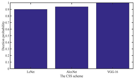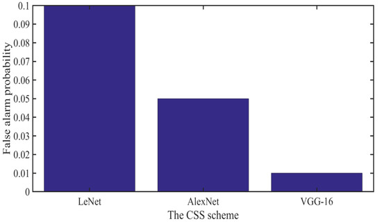 Figure 6 and Figure 7, respectively, provide the detection probability comparisons and the false alarm probability comparisons among the proposed CNN-based CSS schemes. From Figure 6, the detection probabilities of the three CNN-based CSS schemes are all above 0.9, which indicates a stronger ability to protect the PU for the proposed schemes. In addition, the detection probability improves from LeNet to VGG-16. Based on the analysis in Section 4.2, the detection probability of the proposed CNN-based CSS schemes is gradually improved with the rise in the network depth. This indicates that the network depth helps with the feature acquisition of the primary signal and the sensing performance is at a high level in return. In Figure 7, the false alarm probability of the proposed CNN-based CSS schemes is always below 0.1, even below 0.05 for AlexNet and VGG-16, which indicates that the proposed schemes can keep the throughput of the cognitive system at a high level. In addition, the false alarm probability decreases gradually from LeNet to VGG-16. The same conclusion can be obtained from the detection probability—that the network depth contributes to decreasing the false alarm probability.