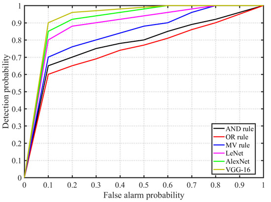 - The classical LeNet network, AlexNet network and VGG-16 network are trained on the proposed dataset. The corresponding false alarm probability and detection probability of the three networks are analyzed and compared.