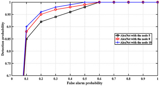 As a supplement, the influence of the sensing node on the sensing performance is exhibited in Figure 9 based on the proposed AlexNet network-based CSS scheme, where the sensing node varies from 5 to 8 and from 8 to 10. From Figure 9, the sensing performance of the AlexNet network-based CSS scheme increases with the rise in the sensing node, which indicates that the sensing performance of the proposed CSS scheme is positively correlated with the sensing node.