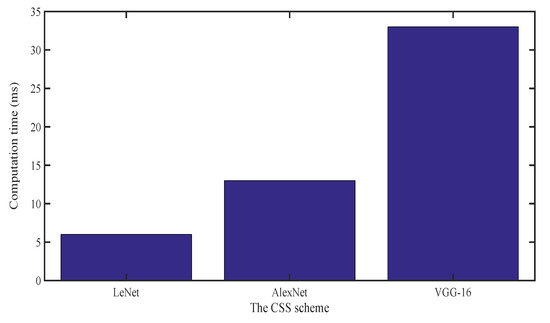 To further evaluate the performance of the proposed CNN-based CSS schemes, the average computation time is analyzed in Figure 10. Note that the computation time denotes the processing time of a picture through the CNN network, where the CNN network is trained in advance. In the simulations, many tests are conducted and the average computation time denotes the average value of the processing time for a picture. From Figure 9, the average computation time of the LeNet network-based CSS scheme is the lowest, while the average computation time of the VGG-16 network-based CSS scheme is the highest. This means that the sensing accuracy of the VGG-16 network-based CSS scheme is at the expense of the system overhead. As a result, the selection of the appropriate CNN-based CSS scheme depends on the system requirement of the sensing accuracy and the sensing speed.