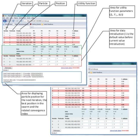 where: xi(t) is the position of particle i at iteration t, xi(t + 1) is the position of particle i at iteration t + 1, vi(t) is the velocity of particle i at iteration t, vi(t + 1) is the velocity of particle i at iteration t + 1, ω is the inertia (a coefficient, which serves as the memory of the previous velocities), c1 and c2 are “acceleration” constants, r1(t) and r2(t) are random real numbers, chosen in the interval [0,1]; 0 ≤ r1(t), r2(t) ≤ 1, yi,t is the best position visited by particle i up to that moment, yi,t − xi(t) is the cognitive component (representing the own experience of particle i), zt is the best position up to the moment t identified by the whole swarm of particles, zt − xi(t) is the social component (representing the opinion of the whole swarm about the best experience that the swarm met up to the moment t). According to the literature in the field, c1 and c2 are chosen in the interval [0,4] (e.g., [,,,,,,,,,]). The evolutionary algorithm is repeated while a termination criterion is achieved or the changes to the level of velocity are close to 0. A utility function f(xi(t)) is associated with the algorithm for assessing the solution’s optimality. In the context of Equations (1) and (2), one can conclude that: