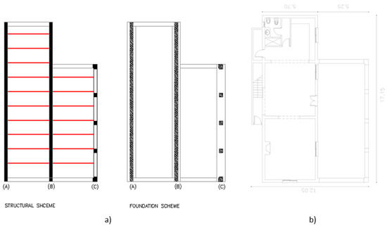 (a) Structural scheme of the damaged building, formed by three load-bearing walls, A, B, and C, and forged of semi-resistant joists, 24 cm thick. Building foundation scheme formed by three parallel, longitudinal shallow foundations (A, B, C), where the load-bearing walls rest and transmit the structure’s weight. (b) Floor plan of the distribution of the damaged building in the slope.