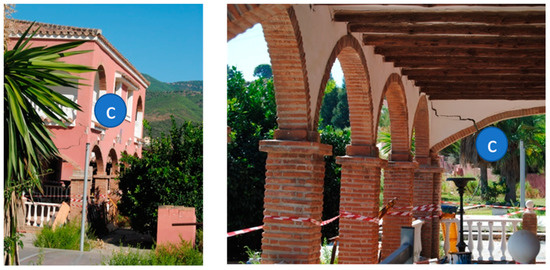 The building’s state of conservation in April 2012, after the movement of the subsoil and its shallow foundation. (C—see Figure 2 for reference) Structure of load pilasters and semi-circular arches, a structure that has suffered a decrease in its foundation with respect to the foundations of the load-bearing walls (B) and (A) on Figure 2. This has caused the building to deform and rotate forward.