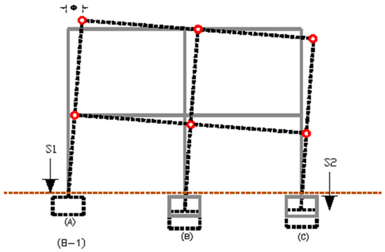 Cross-section scheme, presenting the likely behavior of the building’s foundation and structure. There was a differential settlement of the S1 and S2 foundations due to a possible settlement-removal of the soil and the lack of bearing capacity of the resistant subsoil. Displacement occurred through the variable Φ = 95 mm, which is the depth B and C have descended, with respect to A. The seat of the foundation for wall A (S1) has lowered a depth of 25 mm, remaining within the admissible limit according to the Spanish Building Technical Code (CTE).