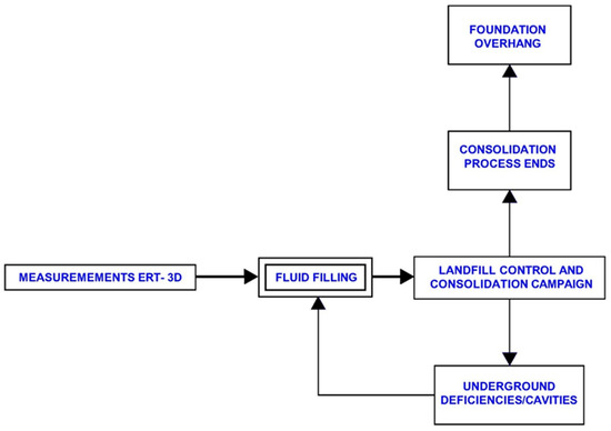 In the present case study, to implement the methodology, the subsoil cavities and weaknesses were first identified and located beneath the building’s foundations. Secondly, a consolidation grout injection campaign was carried out, enhancing the subsoil conditions to an optimum result. The consolidation fluid injections eliminated the high value of initial subsoil resistivities (up to 3000 Ω m) and moved those resistivities to values between 55 and 1000 Ω m, filling in those cavities. Through this process, ERT-3D showed itself to be a fundamental, minimally invasive tool for research. It was useful both during the project phase and in the follow-up, underpinning work when the consolidation injections were placed under the foundations.