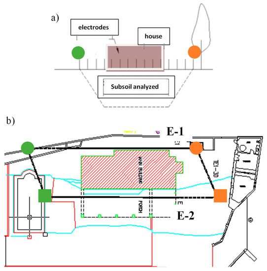 (a) Longitudinal scheme of the methodology and installation of the electrodes at 0.80 m in the building (house), as well as the subsoil analyzed with ERT -3D. The analyzed subsoil has a depth of 5.80 m, which corresponds to levels I and II of the geotechnical layers detected. (b) ERT -3D (TE1-3D) delimited tomography surface, covering the main building’s foundation structure, within the parallel profiles proposed: E1 and E2. Circles refer to the E1 profile, while squares refer to E2; orange refers to the initial UTM coordinates, while green refers to the final ones (Table 3).