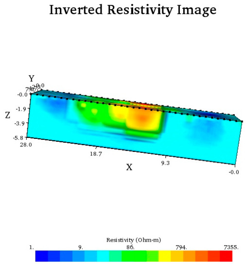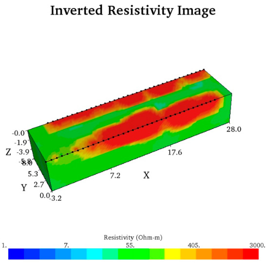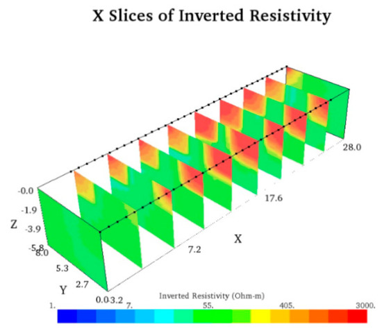 Figure 7 shows resistivity anomalies presented in slices of subsoil supporting the foundation of the damaged building. The red color shows a higher resistivity value, up to 3000 Ωm, which suggests that there are cavities causing the resistivity to rise. From the obtained resistivities, combined with the geotechnical data (SPT standards) [85,86], the physicochemical properties of geological materials can be determined.