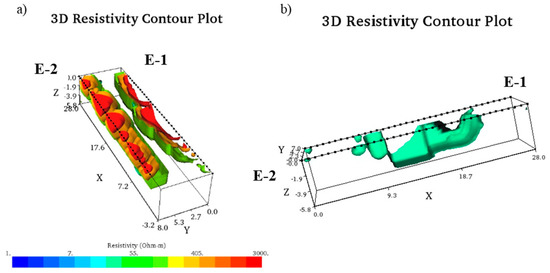 Figure 7 shows a 3D electrical resistivity model from the studied terrain and the depths reached, in this case, up to 5.80 m depth. Both profiles show resistivity values represented in a range of colors for better and easier observation of the variations in subsoil vertical and horizontal resistivities. Zones with resistivity values between 0–55 Ω m corresponded to levels of clay or colluvial material, represented in green; zones between 55–1000 Ω m, shown in orange, corresponded to fillings or colluvium removed with low compactness; and resistivity > 1000 Ω m, in red, indicated anomalies due to the presence of interstitial gaps.